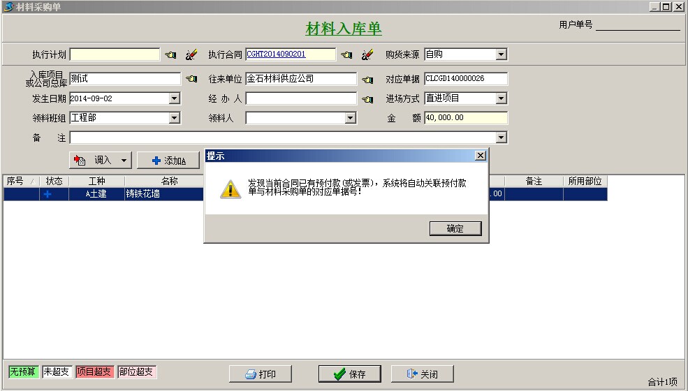 點保存,會提示自動關聯第一次預付款,點確定之后保存單據。
