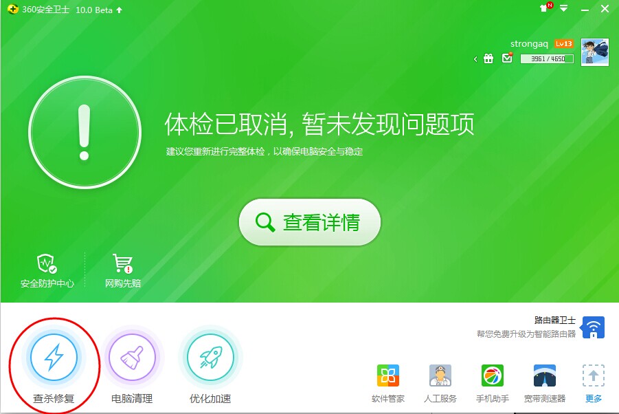 到服務(wù)器電腦上找到360安全衛(wèi)士(截圖電腦為最新版360安全衛(wèi)士,版本不同顯示可能有差距)打開(kāi),找到查殺修復(fù)打開(kāi)