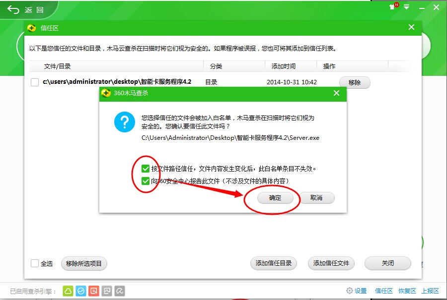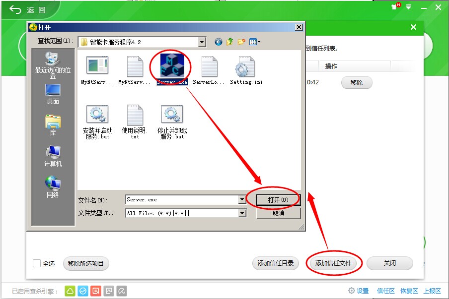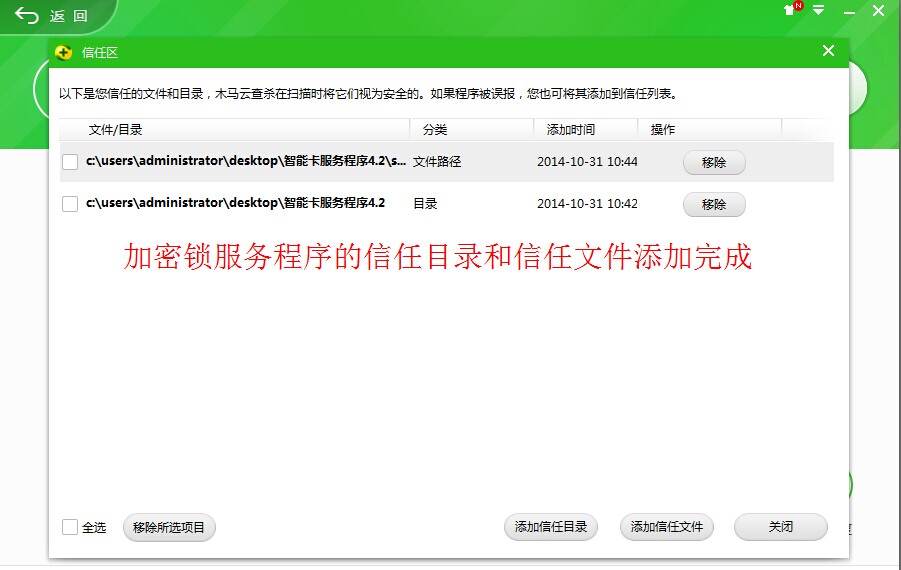 信任目錄添加完成,然后點(diǎn)擊添加信任文件,找到加密鎖服務(wù)程序文件夾打開(kāi),找到