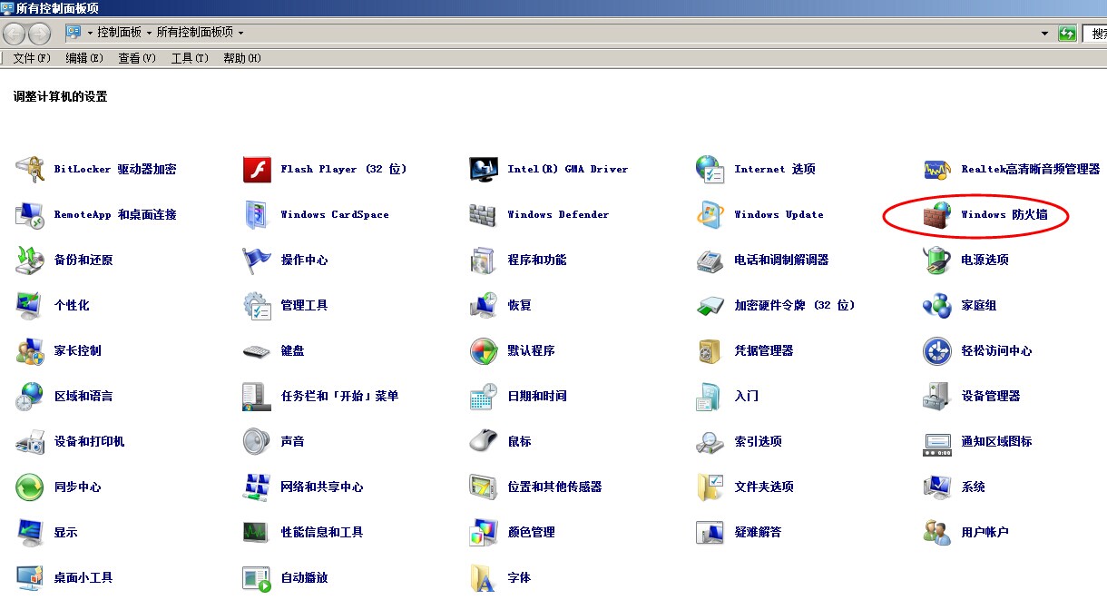 彈出所有控制面板項(xiàng)窗口,找到Windows防火墻項(xiàng)打開(kāi)