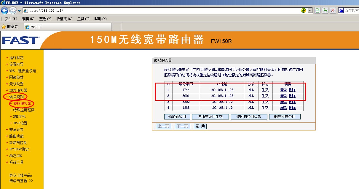 進(jìn)入路由器,找到轉(zhuǎn)發(fā)規(guī)則(路由器型號(hào)不同,名稱(chēng)有差異)分類(lèi)中的虛擬服務(wù)器,會(huì)顯示金石軟件兩個(gè)端口1744(軟件)和3001(加密鎖)的映射。