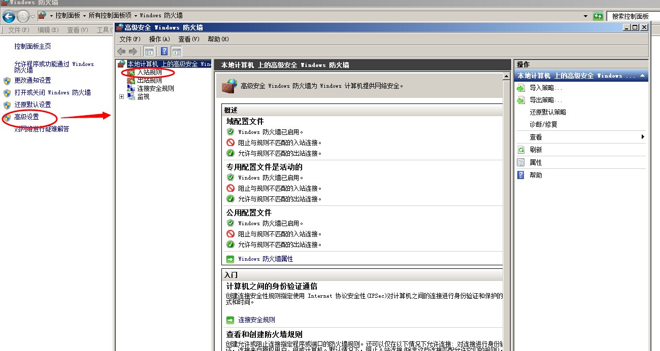 彈出Windows防火墻窗口,點(diǎn)高級(jí)設(shè)置,彈出高級(jí)安全Windows防火墻窗口