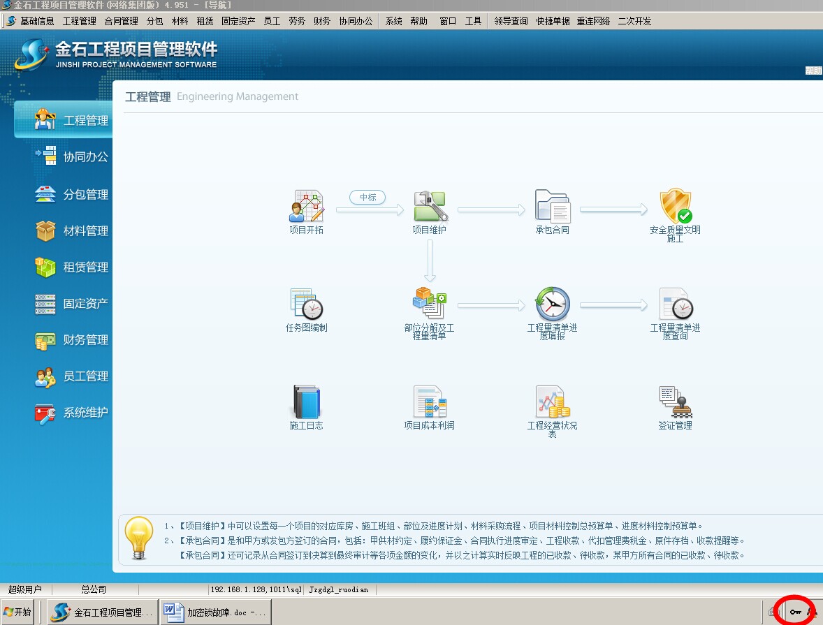 ② 如服務(wù)器插有加密鎖,則檢查加密鎖的服務(wù)程序是否開(kāi)啟,到服務(wù)器電腦桌面右下角的任務(wù)欄是否啟動(dòng)了加密鎖服務(wù)程序