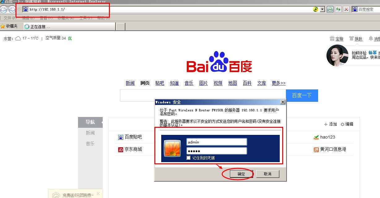 打開(kāi)瀏覽器,在瀏覽器地址欄輸入路由器登錄地址,示例路由器登錄地址為192.168.1.1回車(chē),彈出路由器登錄賬號(hào)和密碼窗口,輸入路由器的賬號(hào)密碼,點(diǎn)擊確定。