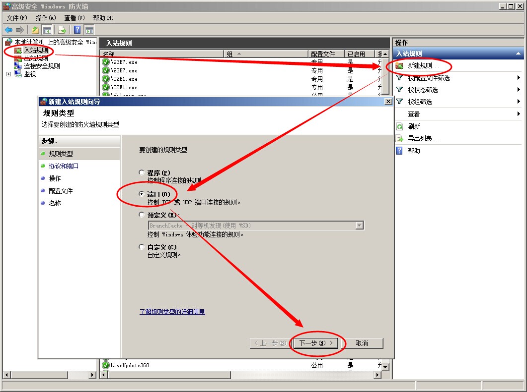 點(diǎn)入站規(guī)則----新建規(guī)則,在彈出的新建入站規(guī)則向?qū)Т翱谥羞x端口項(xiàng),點(diǎn)下一步