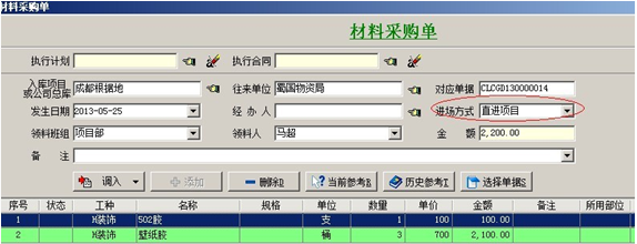 2. 【材料采購(gòu)單】也稱(chēng)為:材料驗(yàn)收單、材料入庫(kù)單,是材料采購(gòu)時(shí),材料到達(dá)現(xiàn)場(chǎng)后要填寫(xiě)的單據(jù)。在單據(jù)填寫(xiě)時(shí)進(jìn)場(chǎng)方式分為:采購(gòu)入庫(kù)和直進(jìn)項(xiàng)目。與其他入庫(kù)單相同,進(jìn)場(chǎng)方式選擇直進(jìn)項(xiàng)目時(shí),明細(xì)中的材料金額會(huì)直接進(jìn)入單據(jù)所選的項(xiàng)目成本中。