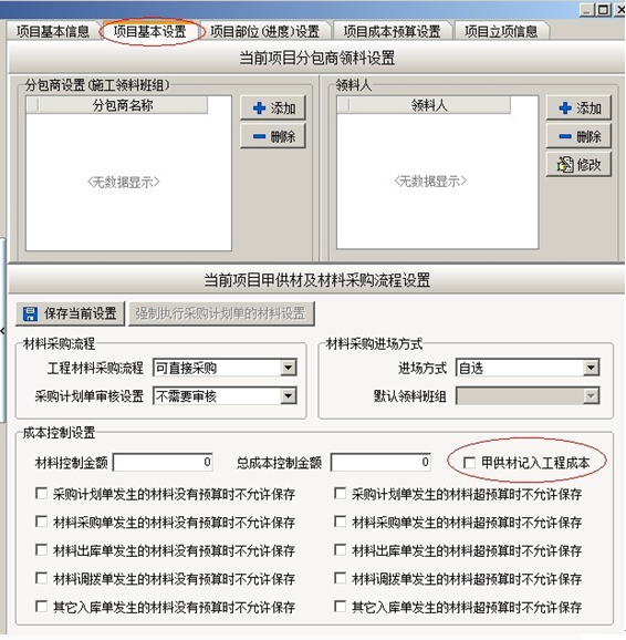 (二)、甲供材料,是項(xiàng)目所用材料由甲方公司提供。在默認(rèn)情況下甲供材不會(huì)統(tǒng)計(jì)入項(xiàng)目成本,如果用戶(hù)希望甲供材統(tǒng)計(jì)入項(xiàng)目成本,必須在項(xiàng)目維護(hù)中把相關(guān)開(kāi)關(guān)打開(kāi),如下圖: