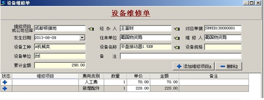 1. 【設備維修成本】是指公司設備在項目使用過程中出現故障,用于維修該設備所產生的成本。成本根據設備維修單生成,該成本會自動計入填寫單據時維修單所選擇的項目。