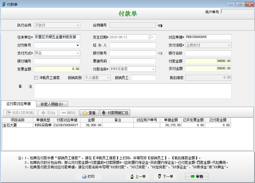 單據已經審核完成,進行付款。做2筆付款單,一個付款單金額為39000,支付方式類別為銀行或者現金。一個付款單金額為170,支付方式類別為其它。如下圖: