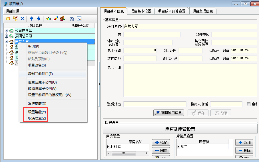 工程管理-項目維護-選中項目右鍵設置隱藏或者取消隱藏。 如下圖: