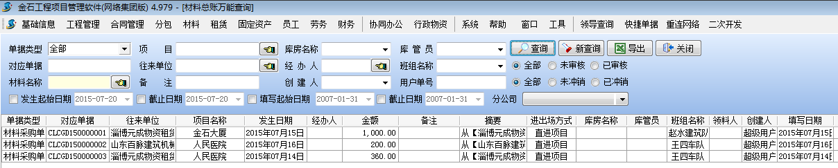 2.3.1設置項目隱藏前查詢時統計所有項目數據,我們以材料總賬萬能查詢為例,如下圖