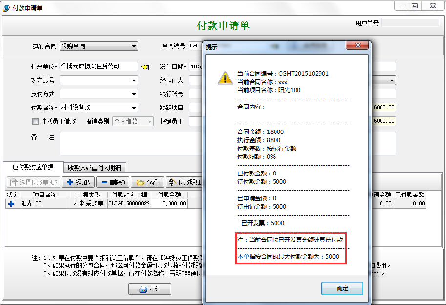 現在針對該采購合同進行付款,根據軟件控制,最大可付金額為發票金額5000,超過5000,軟件會有超付提示,并且并且付款申請單或者付款單不能保存。如下圖: