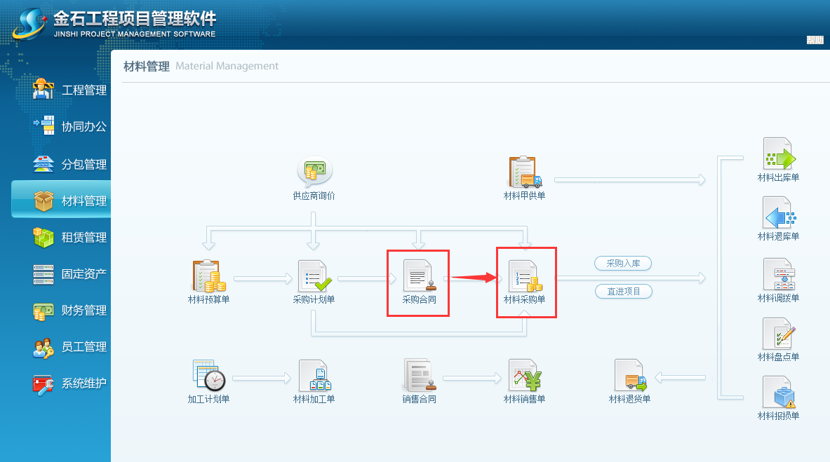 建筑材料管理軟件中材料采購計劃可以根據(jù)項目對材料的需求限制材料采購的具體數(shù)量。而材料采購合同可以限制材料采購的金額,兩者的結(jié)合,可實現(xiàn)了材料采購的量與價的控制,從而可以利用建筑材料管理軟件的材料管理模塊控制項目的材料成本。