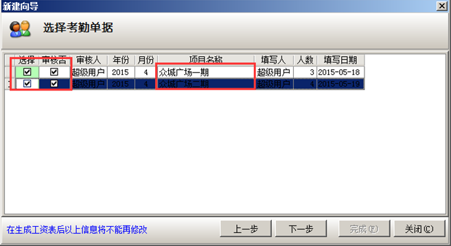 在做員工工資表時(shí),選擇生成四月份工資表,并同時(shí)選擇“眾城廣場(chǎng)一期”和“眾城廣場(chǎng)二期”的考勤單據(jù)。