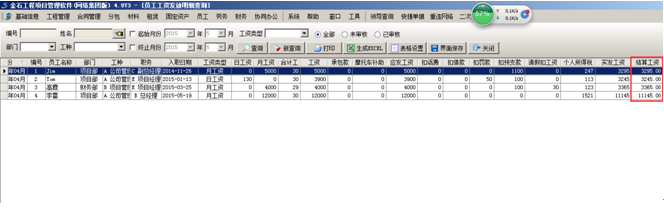工程管理軟件中結(jié)算完成之后,對(duì)應(yīng)的員工工資信息會(huì)顯示結(jié)算完成的顏色,并且可查詢到對(duì)應(yīng)工資流水,如圖:
