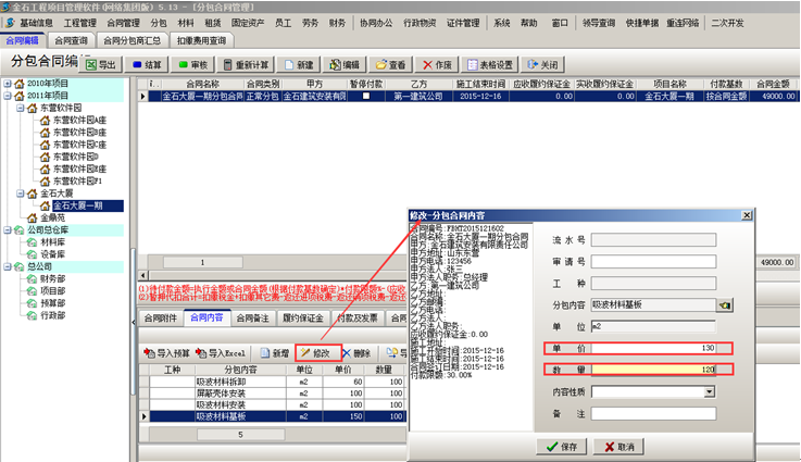 合同內容修改則系統根據合同內容的更改重新計算合同金額,如圖: