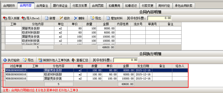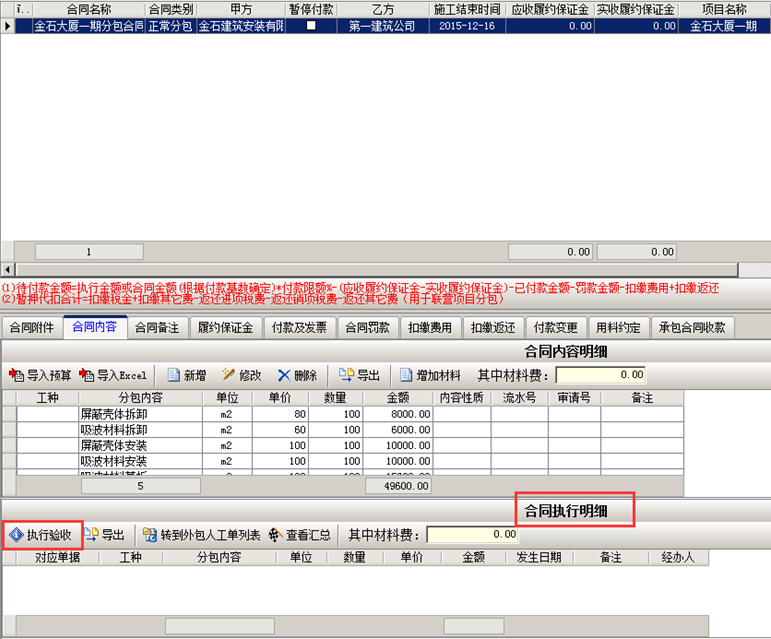 驗收完成,系統生成合同執行明細,如下圖所示: