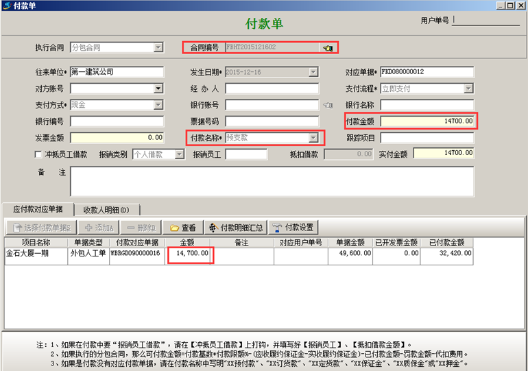 添加“付款單”,付款名稱為“預付款”、對應好合同編號、輸入付款金額,如圖所示: