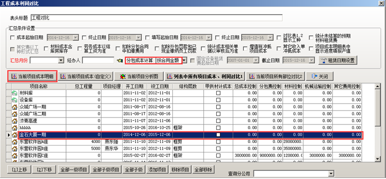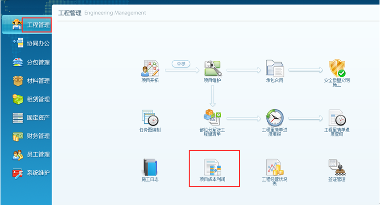 在“工程管理”-“項目成本利潤”中進行項目成本利潤的查詢。如圖: