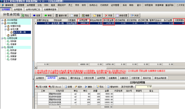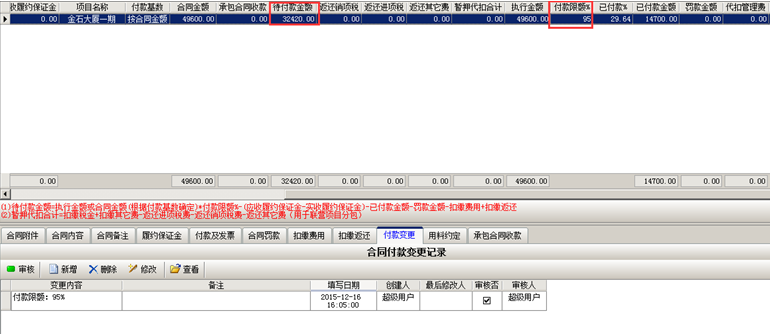 合同內容導入系統之后,系統會計算合同金額以及代付款金額。如圖: