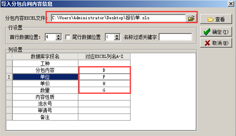 內容與各列名對應好之后點擊確定合同內容導入系統中。注:導入的分包內容要連續,如果有分段分組現象,要先手工刪除,再執行導入!
