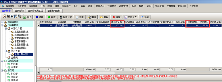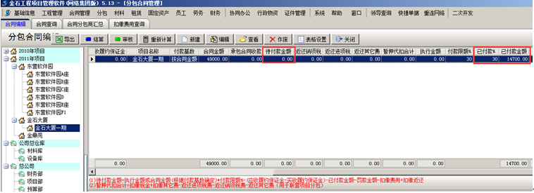 預付款完成則分包合同中“已付款金額”及“待付款金額”會發生改變,如圖所示:
