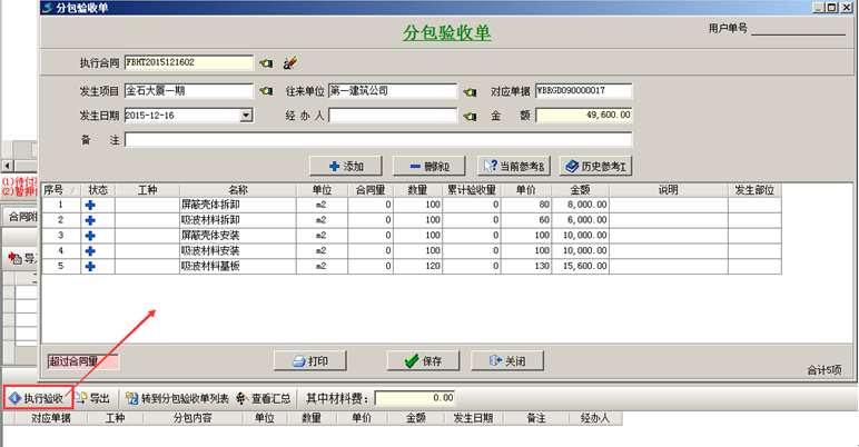 【合同執行明細】中點【執行驗收】,生成【分包驗收單】。