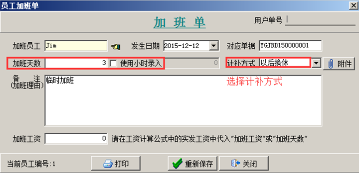 工程管理軟件中添加員工加班單的基礎信息,輸入加班天數(shù)(如果加班是以小時計算則在“使用小時錄入”的復選框打鉤),選擇“計補方式”為“以后換休”。如圖: