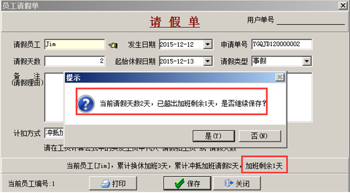 員工再次請假并且累計請假天數(shù)超過加班天數(shù)時系統(tǒng)給出提示。如圖所示:
