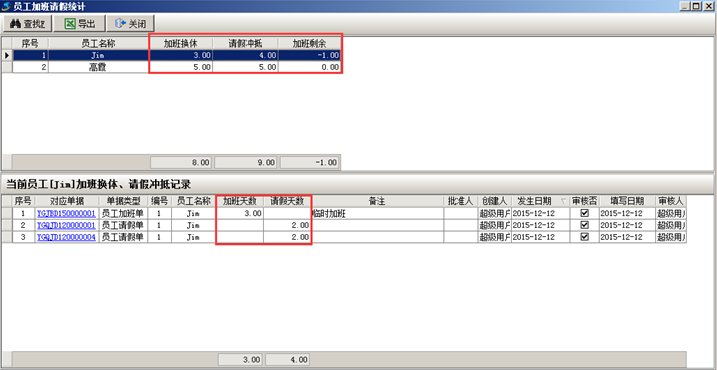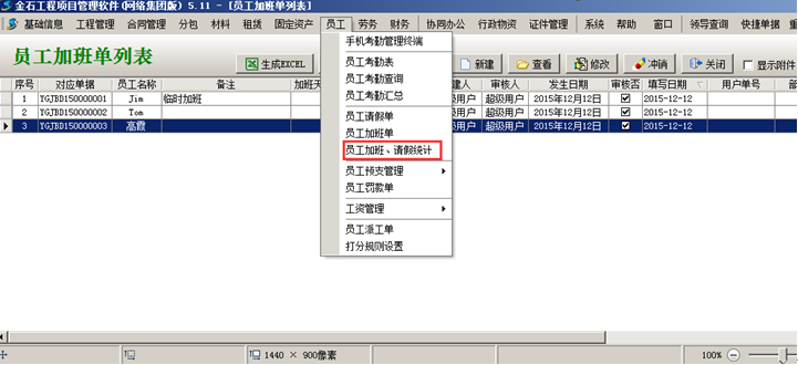 員工加班請假統(tǒng)計情況可在工程管理軟件中進行查詢,如圖: