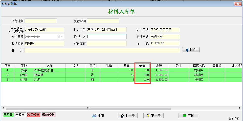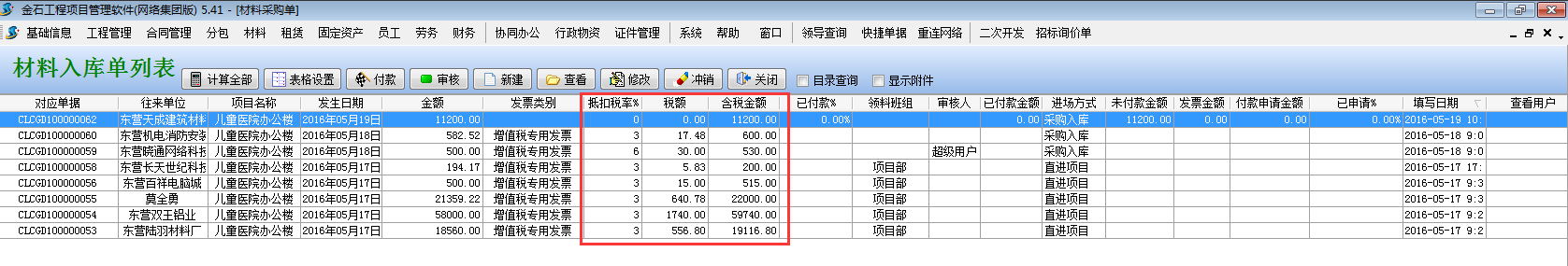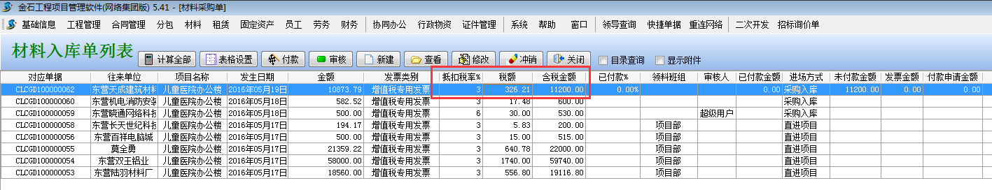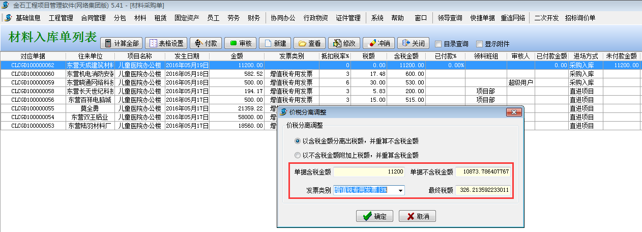2.在營改增后.以前版本做的單據如何實現價稅分離調整?我們以材料入庫單(即材料采購單)為例,進行演示: