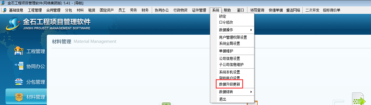備注:升級到最新版本后,需要登錄超級用戶點擊主菜單【系統】-【數據升級更新】。如下圖: