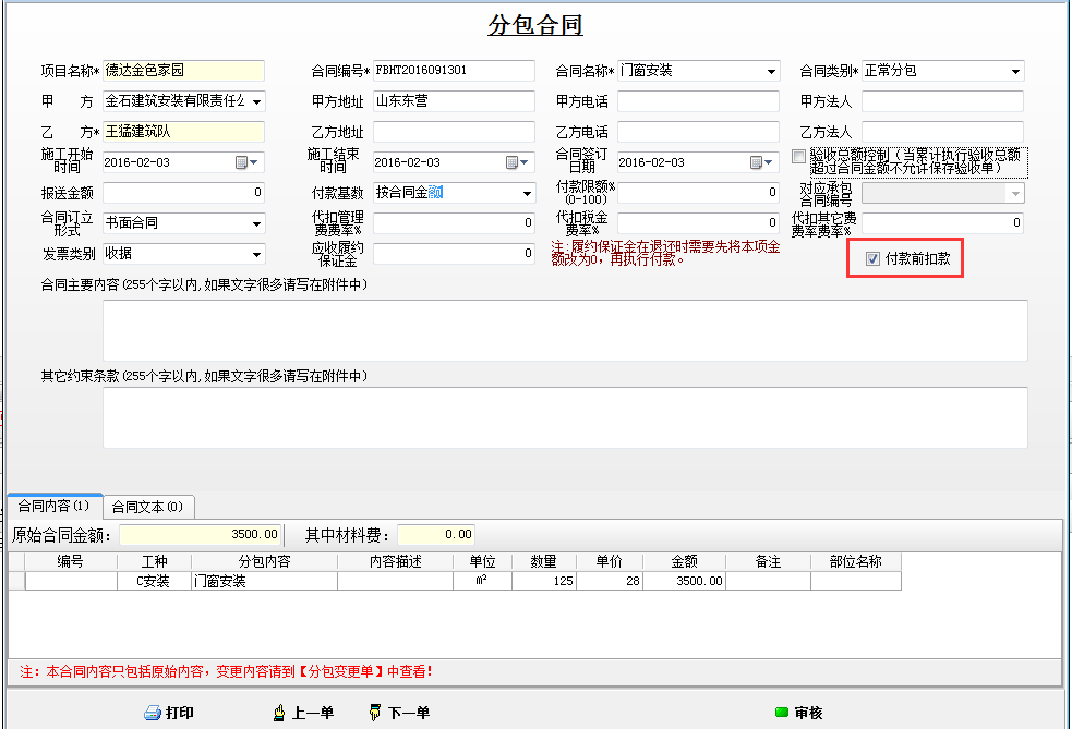 新建分包合同時在“付款前扣款”處打鉤。如下圖: