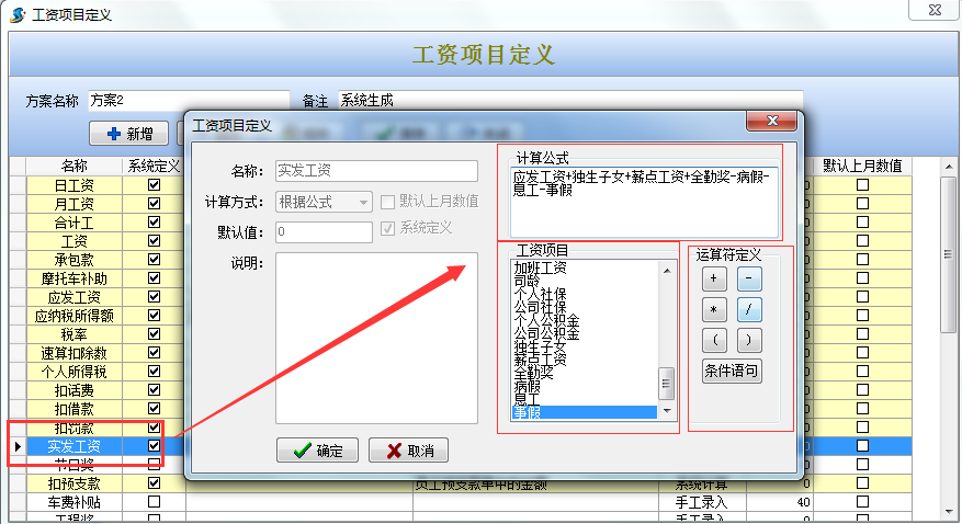 雙擊選擇實(shí)發(fā)工資,通過工資項(xiàng)目和運(yùn)算符定義編輯計(jì)算公式(運(yùn)算字符一定要用鼠標(biāo)點(diǎn)擊下圖運(yùn)算符定義選擇,不能用鍵盤直接輸入)