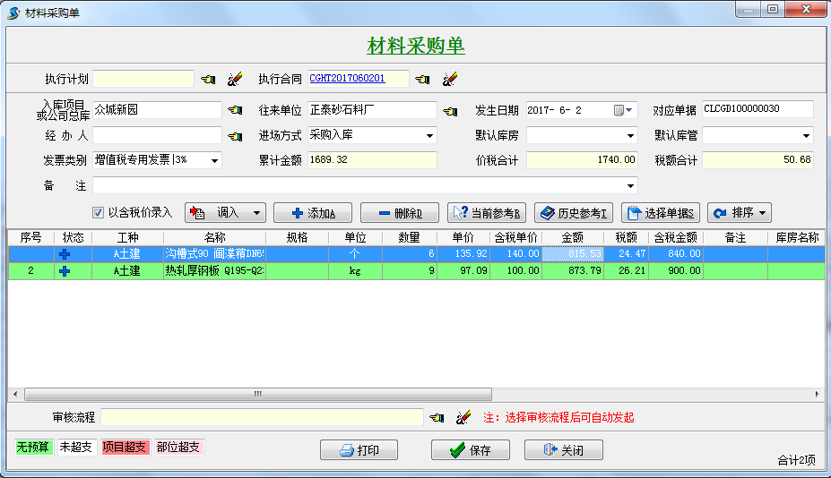 新建【材料采購單】,選擇執(zhí)行的合同,輸入實際的到貨量,入場的方式和倉庫,是否含稅等內(nèi)容