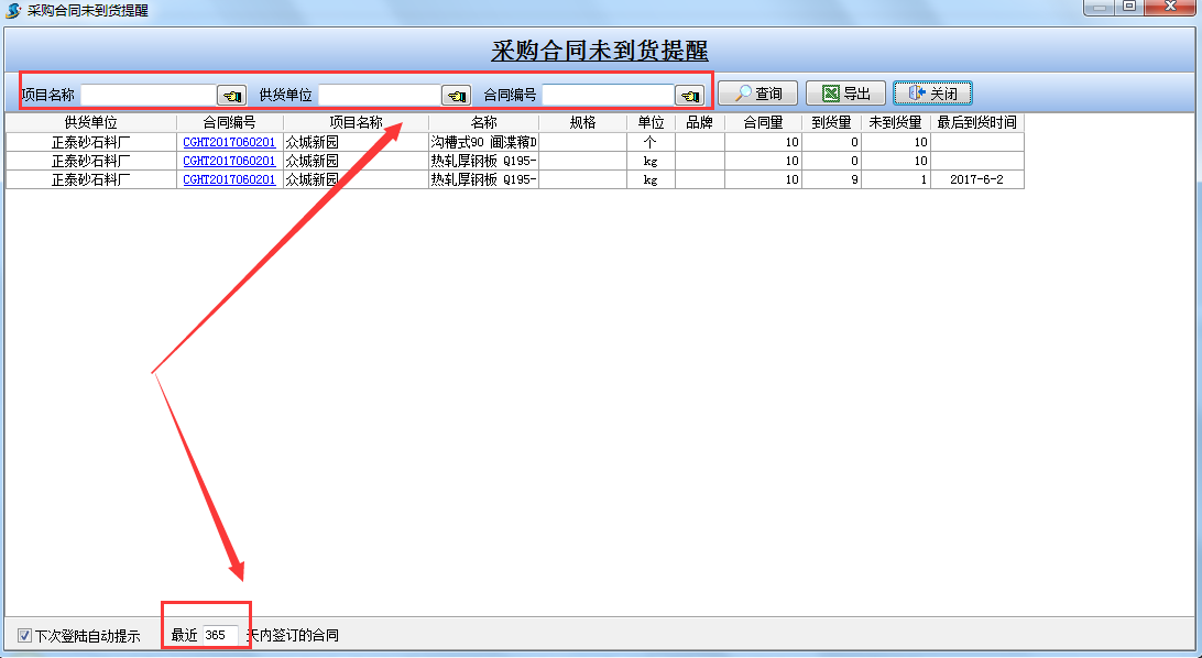 可根據(jù)項目名稱、供貨單位、合同編號,按照時間檢索一定時間段內(nèi)的合同未到貨信息 如下圖: