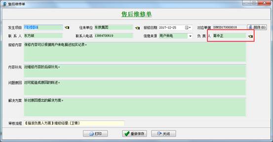 分管員接到用戶電話,根據用戶的描述手動添加【售后維修單】,填寫必要內容,如發生項目,單位名稱,報修的內容等,然后選擇審核流程方案,提交給售后部門經理審批。