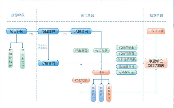 單位自負(fù)盈虧。我方單位對甲方收取工程款開出發(fā)票;對供應(yīng)商付材料款等費(fèi)用收進(jìn)發(fā)票;對掛靠單位代扣稅金、管理費(fèi)后返還工程款等。金石工程項(xiàng)目管理軟件基本流程如下圖: