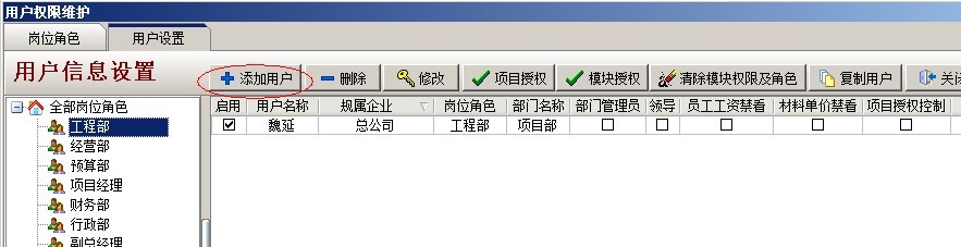 點擊添加用戶,在彈出的窗口中,依次添加好用戶信息,主要包含用戶名、密碼、所屬部門、所屬公司等。