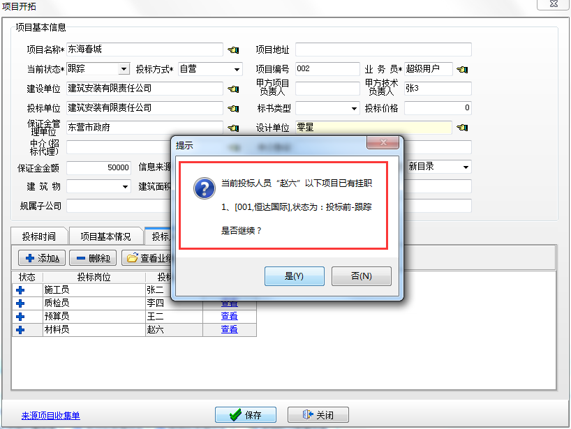 上圖中,張二、趙六兩個投標(biāo)人員已參與恒達(dá)國際的投標(biāo)項(xiàng)目,我們保存看下提示效果,如下圖: