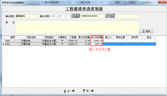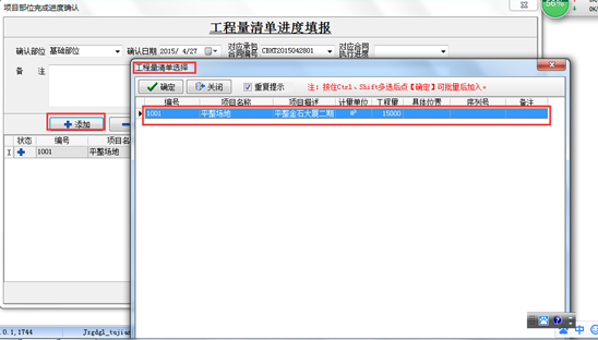 然后點“添加”按鈕,在彈出的“工程量清單選”窗口中選擇需要填報的清單內(nèi)容,然后在本次完成量處輸入已完成的工作量,如圖:
