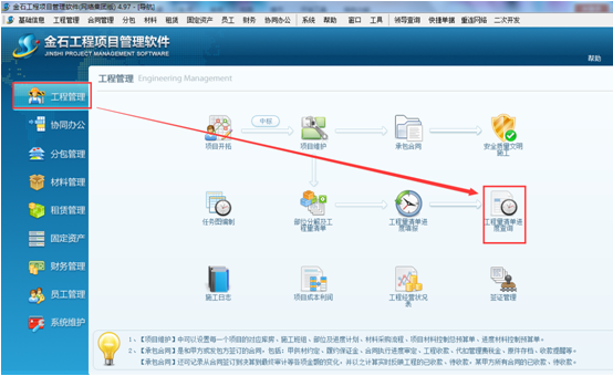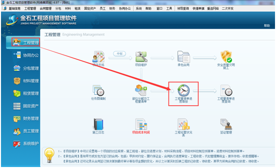 “工程量清單進(jìn)度查詢”在工程進(jìn)行過程中,可以隨時查詢現(xiàn)場填報已完成工程量清單,從而方便向甲方報施工進(jìn)度。按進(jìn)度進(jìn)行結(jié)算。1.進(jìn)入系統(tǒng)的“工程管理”模塊,點擊“工程量清單進(jìn)度查詢”,如圖: