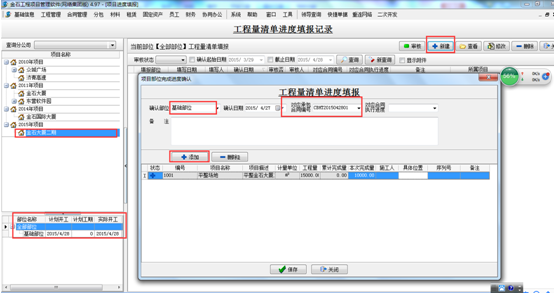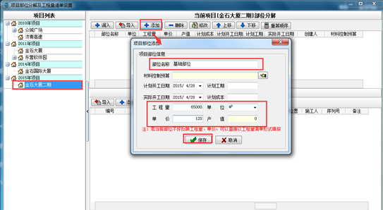 如下圖所示,在彈出的“項目部位分解及工程量清單設(shè)置”窗口中點“添加”按鈕,然后依次填寫項目部位名稱、工程量、單位等相關(guān)信息,