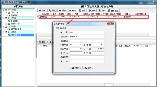 點當(dāng)前部位的工程量清單設(shè)置下面的“添加”按鈕,在彈出工作清單編輯窗口,依次錄入內(nèi)容,然后保存。