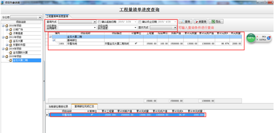 2.選中相應(yīng)的項目,點查詢,查看工程量清單進(jìn)度。也可輸入查詢條件進(jìn)行查詢,如圖: