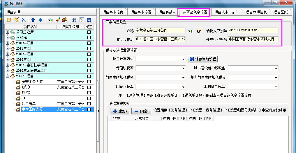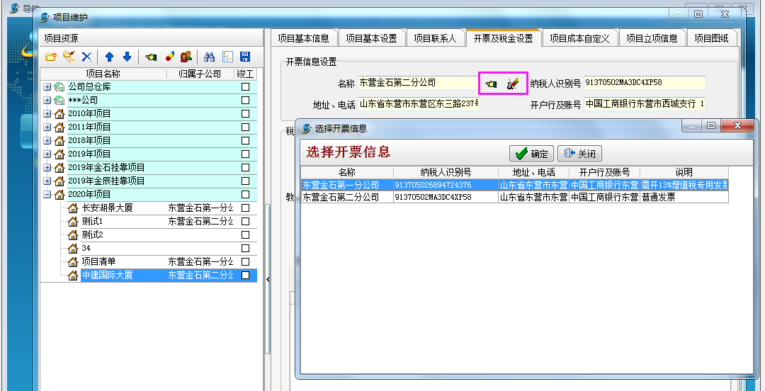 3、項(xiàng)目維護(hù)設(shè)置歸屬子公司后會(huì)自動(dòng)帶入開票信息。