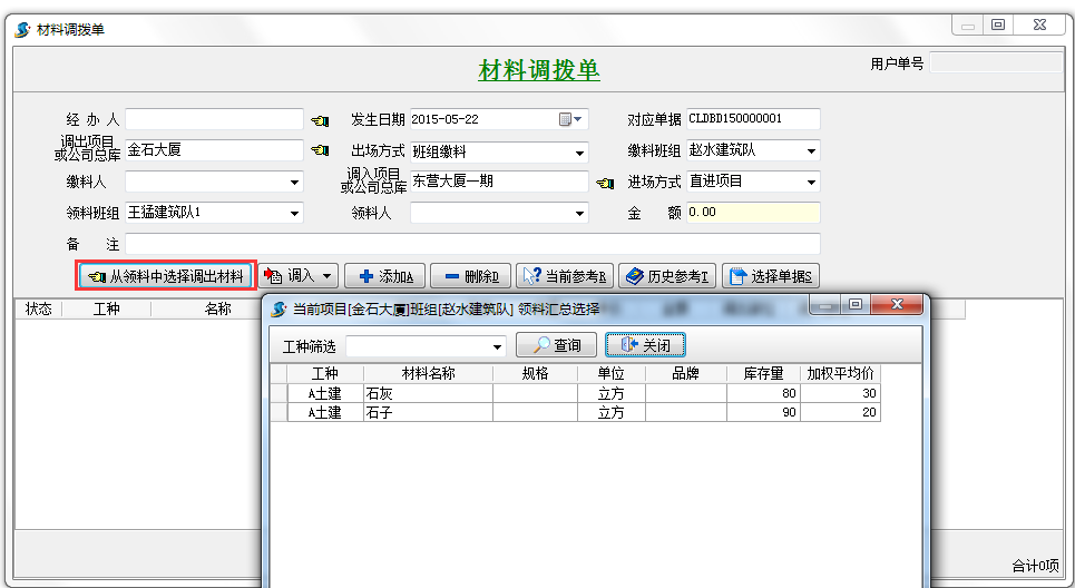當出場方式為:【班組繳料】時(即施工班組把材料送回來),【添加】左邊的按鈕顯示為【領料選擇】,再點擊前要先選擇好【繳料班組】,如下圖:顯示當前班組【趙水建筑隊】的領料匯總情況。通過【領料選擇】可以讓用戶直接從班組的領料記錄中調出材料,既提高效果、又避免出錯。