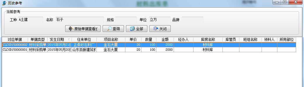 選中材料【石子】點擊【歷史參考】,可以看【石子】的歷史明細記錄,如下圖