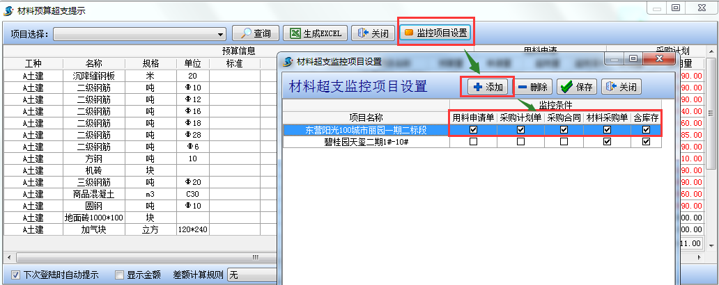 新版本中的預(yù)算超支提示可按不同項(xiàng)目分別設(shè)置預(yù)算與“材料管理”中一系列的單據(jù)進(jìn)行對(duì)比如下圖:預(yù)算量分別對(duì)比 “用料申請(qǐng)單” “采購計(jì)劃單” “采購合同” “材料采購單” 是否包含“庫存” (老版本中只有兩量對(duì)比且不能按項(xiàng)目區(qū)分設(shè)置)