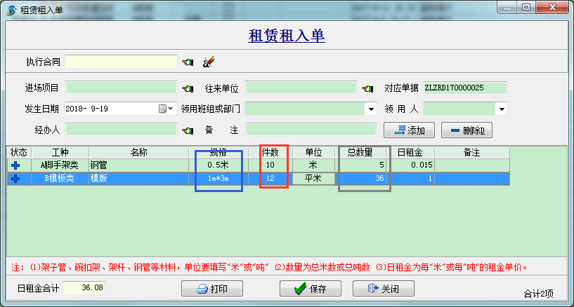 按件數(shù)計算的租賃材料,調(diào)用時系統(tǒng)會自動換算成平米、平方米、m2、M2等計費單位。如上圖